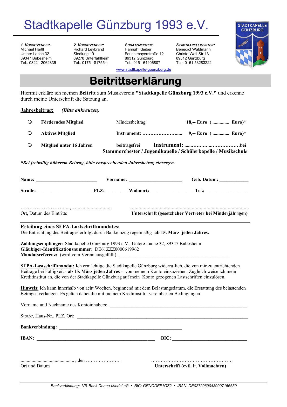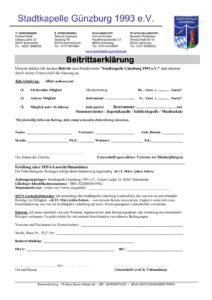 Sie möchten der Stadtkapelle Günzburg beitreten? Unten finden Sie unsere Beitrittserklärung zum Herunterladen.